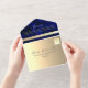 Feiern Sie stilvoll mit dieser königsblauen und goldenen Kalligraphie-All-in-One-Hochzeitseinladung. Mit seinem eleganten Drehbuch, einem reichhaltigen marmorblauen Hintergrund und einem anpassbaren Foto im Hintergrund ist dieses Design perfekt für luxuriöse und anspruchsvolle Hochzeiten geeignet. Einfach mit Ihren Daten personalisieren. Bitte beachten Sie: Diese Einladung erfordert einen separaten Briefumschlag. Wir empfehlen die Verbindung mit einem A9-Umschlag (5,75" x 8,75") für die beste Passform.