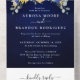 Elegante und moderne rustikale Hochzeitseinladung mit hellgelben Sonnenblumen, königlich blauen Pfannenbäumen, Babyatmen, Gipsabila Blumenrahmen / Kranz mit Eukalyptus-Blätter. Weitere passende Designs und Variationen finden Sie in meinem "Blitzweddingpaperie" Shop. Und zögern Sie nicht, mich für weitere Anpassungen oder Match-Artikel zu kontaktieren.