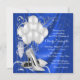 Königlich blaue und silberne Geburtstagsfeier mit schönen silbernen Glitzer-High-Heel-Schuhen, Ballons, Champagnerperlen und eleganten silbernen Wirbel auf luxuriösem königsblauen Satin-Hintergrund. Diese elegante, blau-silberne Geburtstagsfeier-Einladung lässt sich leicht an Ihre Veranstaltung anpassen, indem Sie einfach Ihre Details in den Schriftart-Stil und Farbe, Wortlaut und Layout Ihrer Wahl einfügen. Sie können auch die Wirbel, Champagner und Ballons verschieben oder löschen. Das ist ein gedrucktes Design ohne echte Juwelen, Perlen, Glitzer, etc.