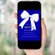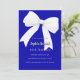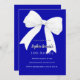 Ein königsblauer Hintergrund, mit einem großen weißen Bogen verziert. Personalisieren und fügen Sie einen Namen und Party-Details hinzu.