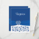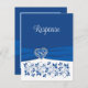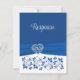 Diese romantische, blaue und weiße, blumengeschmückte RSVP-Karte mit Wahlmöglichkeiten hat ein Bild eines silberfarbenen und königsblauen filigranen Herzens über einem königsblauen Farbbandbild, das sich durch den unteren Teil der Antwortkarte zieht, mit blauen Blumen auf weißem Hintergrund unter dem Band und dem Wort "Reaktion" in großer weißer Schrift auf blauem Hintergrund über dem Band. Die Rückseite ist in königsblau und weiß gehalten. Die UAWG und die Auswahl der Speisen sind in zwei königsblauen Farbtönen mit einem königsblauen Herzstück oben und einem Scrollrahmen rund um den Text gedruckt. Wenn Sie weitere passende Artikel benötigen, schicken Sie Ihre Anfrage bitte an niteowlstudio@gmail.com oder nutzen Sie die Zazzle-Chat-Funktion, um die Touch zu erhalten.