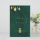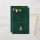 Royal Emerald Green Golden Hanging Lights Wedding Menu Cards. Diese Hochzeitskarte ist wie ein kleines Stück Magie! Die Vorderseite hat einen schönen smaragdgrünen Hintergrund mit glänzenden goldenen Lichtern, die oben blinken und ihm ein magisches Gefühl geben. Die Namen der Ehepaare sind elegant geschrieben, ebenso wie das Hochzeitstag und der Veranstaltungsort. Die Rückseite ist auch smaragdgrün, mit den gleichen zauberhaften goldenen Lichtern. Oben steht "The Menu" in einem schönen Schriftart. Unten finden Sie eine Liste mit allen köstlichen Geschirr, von Vorspeisen bis zu Desserts, die alle in edlem Gold geschrieben sind. Es ist eine ganz besondere Touch für Ihre Hochzeitsfeier.