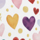 This striking seamless pattern features a rich, high-contrast mix of watercolor hearts in deep plum, emerald green, and ruby red, balanced by soft blush and golden amber tones. Building on the botanical elements of the later series, it includes elegant gold leaf sprigs, hollow gold heart outlines, and shimmering gold glitter dots. The combination of deep jewel tones and bright gold accents against a crisp white background makes this an ideal choice for luxury gift packaging, sophisticated textiles, or statement digital wallpapers.