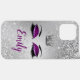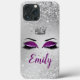 Das Royal Lila Glitzer Eyes Monogram Phone Case verfügt über eine Silver Queen's Crown und eine Augenlide mit Royal Lila Glitzer Aushadow, Diamanté Effekt Liner mit langen schwarzen Wimpern auf einem silbernen Glitzer Effekt Hintergrund. Personalisieren Sie mit dem Namen Ihrer Wahl in Übereinstimmung mit Royal Lila. Entworfen von Jacqueline. Personalisiert von dir.