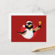 Postkarte mit einer Abbildung von niedlichem kleinen königlichen Pinguin, der ein Skepter hält und eine rote Weihnachtsmannmütze trägt; Weihnachts-Cartoon-Design für Kinder, auf rotem Hintergrund