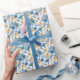 Discover this wrapping paper that embodies a unique color harmony! It features a captivating watercolor-style design of roses and wildflowers, where dusty blue and mustard gold intertwine, creating a warm and inviting contrast against a white background.