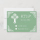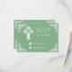 Eine weise grüne UAWG-Antwortkarte mit einem weißen Blumenkreuz und Schnörkeln in der Ecke. Teil der Floral Cross Christening Collection.