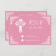 A rose pink RSVP response card with a white floral cross and corner flourishes. Part of the Floral Cross Christening Collection.