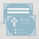 Eine himmelblaue UAWG-Antwortkarte mit einem weißen Blumenkreuz und Schnörkeln in der Ecke. Teil der Floral Cross Christening Collection.