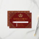 Elegante RSVP-Karte mit einem verzierten goldenen Rahmen und einer schönen Krone auf dunkelrotem Hintergrund.
