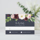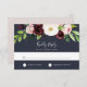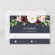 Die elegante RSVP-Karte in Aquarellfarben bietet eine Reihe von blühenden Rosa-, Bordeaux- und Elfenbeinblüten mit üppigem botanischem Blattwerk. Personalisieren Sie Ihre Wunschtermin sowie Ihre individuelle Akzeptanz und Ablehnung von UAWG auf einem marinebasierten Hintergrund. Entworfen, um unsere Blush Romance und Midnight Romance Hochzeit und besondere Event-Sammlung zu passen.