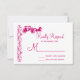 Eine rustikale Landkarte für die Hochzeitskampagne mit einem Pferd- und Kutschendesign mit eleganten, Vintagen Blume und Weinreben, die in der warmen, rosa Fuchsia Magenta-UAWG auf weißem Hintergrund abfließen. Diese sind so konzipiert, dass sie den Einladungen für Hochzeitsfeiern und Buggyen im Landhausstil entsprechen: