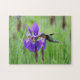 Ein Rubin-throated Kolibri, der auf einer lila Iris füttert.