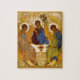 Antikes Andrei Rublev-Kunstwerk/Ikone mit dem Vater, dem Sohn und dem Heiligen Geist, die an einem Tisch sitzen. Die Bilder scheinen Engelsflügel zu haben.