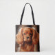 Ein nahes Porträt eines Ruby Cavalier King Charles Spaniel. Der Hund sitzt auf einem weichen, orangefarbenen Stoff mit seinen Pfoten, die schön davor liegen. Seine großen, dunklen Augen blicken direkt auf den Betrachter und vermitteln ein Gefühl von Wärme und Zuneigung. Das Fell des Hundes ist sehr detailliert und zeigt seine weiche Textur und fließende Wellen. Perfektes Geschenk für Cavalier Liebhaber.