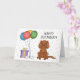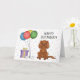 Niedliche Geburtstag Thema Design mit Desteis originale Cartoon-Illustration einer niedlichen rubinfarbenen Cavalier King Charles Spaniel züchten Hund. Neben dem Hund gibt es bunte Geburtstagsballons, die an einem Hundeknochen befestigt sind, und eine lila, gelbe Geschenkbox. Der Hintergrund hat ein spielerisches Muster von bunten Pastellfischen auf weißem Hintergrund. Es gibt auch einen personalisierbaren Textbereich, der nun lautet: "Glücklicher Geburtstag!".