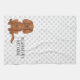 Desteis originelle Cartoon Illustration einer niedlichen rubinfarbenen Cavalier King Charles Spaniel züchten Hund, der sitzt. Der Hintergrund weist ein Muster grauer Hundepfoten auf. Neben der Hundeillustrierung gibt es auch einen personalisierbaren Textbereich.