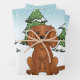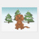 Desteis originelle Cartoon Illustration einer niedlichen rubinfarbenen Cavalier Rasse Hund. Der Hund ist in einer Winterszene untergebracht. In der Szene schneit es im Hintergrund und hinter dem Hund stehen drei grüne Tannen. Die Bäume haben Schnee auf ihnen. Der Hintergrund ist ein hellblau bis weiß Gradienten, die dieses Design, dass Frost kalten Winter-Tag aussehen.
