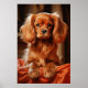 Ein nahes Porträt eines Ruby Cavalier King Charles Spaniel. Der Hund sitzt auf einem weichen, orangefarbenen Stoff mit seinen Pfoten, die schön davor liegen. Seine großen, dunklen Augen blicken direkt auf den Betrachter und vermitteln ein Gefühl von Wärme und Zuneigung. Das Fell des Hundes ist sehr detailliert und zeigt seine weiche Textur und fließende Wellen. Perfektes Geschenk für Cavalier Liebhaber.