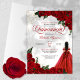 Quinceanera Einladung in rote Rose in Roby mit goldenen Akzenten und ein Mädchen mit elegantem Ballkleid. Karo den Shop für diese Einladung mit Mädchen in verschiedenen Haarfarben und Hautfarben.