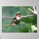 ein buntes Foto eines männlichen rubingebeutelten Hummingvogels mit einem hellen roten Hals, der sich nach einer Jagd niederlässt.