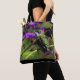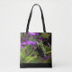 Tote Tasche mit einem schönen, rubingewurzelten Kolibri, der in violetten Blumen sitzt. Foto von Karla Chrast aufgenommen.
