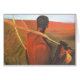 Der Mensch mit Pol und Bogen blickt zurück über eine düstere Landschaft. Helles Rot, Orangen, reine, gelbe Grüntöne und dunkle Dunkel. Kontrastiert einen pastellfarbenen Himmel.