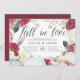 Elegante rustikale Einladungen für Herbst- oder Herbstverlobungstreffen mit bordeauxroten Blume, boho Federn und weißen Kürbissen. "Fall in der Liebe" erscheint oben in schicken Kalligraphieschrift. Personalisieren Sie sich mit Ihren Verlobung Feierlichkeiten Details unten in reich marineblau Buchstaben.
