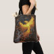 Ein Phönix erhebt sich in einem windgekehrten Schlag von Herbstblättern, standhaft gegen das Bild des schwarzen Vogels am Himmel. Von Paxdomino