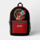 Spaß Rucksack mit fett roten und schwarzen Farben und einem Thema für den Weltraum. Rakete auf der Vorderseite mit deinem Namen.