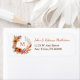 Dieses Adressetikett hat ein schönes Aquarellbild eines orangen und goldenen Blumenkranzes mit dem Monogramm in der Mitte. Ihr Name und Ihre Adresse sind rechts neben dem Bild orange und braun.