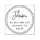 Eine niedliche Rücksendeadresse Briefmarke mit Ihrem Familiennamen in schicken Schriftzeichen. Im Folgenden werden Ihre Adresse oder Kontaktdaten in einfacher serifenloser Schrift gedruckt. Ein handgezeichnet Doodle-Rahmen bildet einen Kreis um den Text. Besuchen Sie unseren Shop für mehr Rücksendeadresse Gummi Briefmarke!