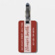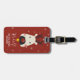Dieses weihnachtliche Gepäcksschild zeigt ein lustiges Cartoon-Bild von Rudolf, dem Rotnasen-Rentier, auf einem roten Hintergrund mit weißen Schneeflocken.