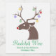 Whimsical aber dennoch elegant genug für Ihren hausgemachten Wein. Es hat einen weißen Hintergrund mit einer braunen Rudolph-Silhouette mit roter Nase. Farbenfrohe Ornamente hängen von seinen Geweihten. Der untere Teil hat einen anpassbaren grünen Text.