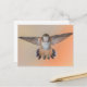Postkarte mit einem orangefarbenen ruföfen Kolibri im Flug, mit seinen Flügeln und Federn im Schwanz, die sich direkt auf Sie richten - eine lustige Karte für Kolibri-, Natur- und Gartenliebhaber. Foto aufgenommen in Pasadena, Kalifornien.