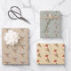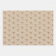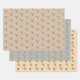 Niedliches Verpackungspapier mit drei verschiedenen rosa Kolibris auf beige, hellgrün und hellbraunem Hintergrund.