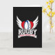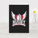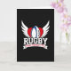 This greeting card features a deep black background where a white-and-navy rugby ball sits at the center, its laces drawn with sharp detail as if it’s just been passed into waiting hands. Two red hearts curve up around the ball like a gentle embrace, adding a romantic touch ❤️. White wings spread out on either side, giving the whole image a light, uplifting lift that feels like a shared crush or team bond 🥰. Below the illustration, “RUGBY” appears in large white letters, centered and easy to read. Under that, a white banner stretches across the card with “Happy Valentine’s Day” written in red lettering across the middle. The strong contrast between the black backdrop and the red, white, and blue elements makes each shape stand out clearly. The hearts sit closest to the ball, with the wings extending outward in bright white arcs.