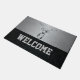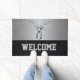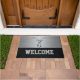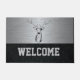 Diese wilde Begrüßungsmatte eignet sich hervorragend für den Junggesellen oder für den Eintritt in eine menschliche Höhle. Das Design zeichnet sich durch einen gigantischen, gedämpften Buck auf einem silbernen Hintergrund aus. Der Boden ist mit einer schwarzen Diamantplatte gesäumt, die große Blockbriefe, die willkommen heißen, enthält.