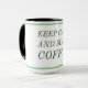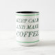 Eine Kaffeemaschine mit einem Design, das lautet: "Behalt Ruhe und Kaffee machen". Dieses Design wurde von Debbie Quick aus Debs Creative Designs erstellt. www.debscreativedesigns.com