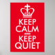 Behalt ruhiges Plakatdesign in Rot-Weiß-Farbe mit dem Text "Behalt ruhig und behalt ruhig". Wenn Sie gewollt haben, den Hintergrund von Rot auf einen anderen zu ändern, können Sie ihn mit der Schaltfläche 'Anpassen' ändern. Es ist ein perfektes Poster für Bibliotheken oder Orte, wo Stille notwendig ist.