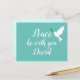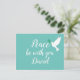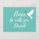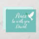 Schöne blaue Postkarte mit der Nachricht Peace be mit dir in schönem weißes Skript. Daneben ist eine fliegende weiße Taube mit einem Olivenzweig. Personalisieren Sie, indem Sie den Namen ändern, um Ihre Anforderungen zu Anzug (oder löschen Sie den Namen, wenn nicht erforderlich).