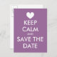 Behalt Ruhe und Save the Date Postkarte. Persönliches Herzdesign für Hochzeitsgäste. Eleganter Text auf der Rückseite für die Nachricht von Braut und Bräutigam.