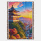Ein japanischer Tempel auf einem Hügel, der bei Sonnenuntergang einen malerischen Blick auf die Stadt und die Berge bietet.