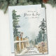 Aquarell landschaftliche 2-in-1 Urlaubsankündigung und Weihnachtskarte mit friedlicher Landschaft von Landweg, Kiefern und Waldvögeln inklusive Eule und Rotkehlchen auf den Zaunpfosten. Die Formulierung lautet "Ihnen Frieden und Freude durch unsere neue Zuhause wünschen" und die Vorlage ist für Sie bereit, mit Ihrer neuen Adresse zu personalisieren.