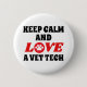 Dieser Button zeigt den Text "CALM BEHALT AND LIEBE A VET TECH" in schwarz und rot Schriftart an. Das "O" in der LIEBE wird durch einen niedlichen Pfotendruck ersetzt. Der Text kann so angepasst werden, dass er "Tierarzt, Hundezüchter" oder die Karriere Ihrer Wahl sagt.