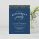 Diese Party Einladung bietet ein stilvolles Design mit elegantem Drehbuch und goldenem Glitzer Konfetti auf marinebasischem Hintergrund.