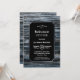 Eine rustikale silbergraue Party Einladung aus blau-grauem Stallholz mit weißem Text auf schwarzem Hintergrund.