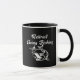 im Ruhestand! Angeln. Weißer Text mit einem weißen Fisch, der kurz davor ist, den Köder auf einem Haken zu beißen.