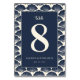Diese elegante Tischkarte für die Hochzeit zeichnet sich durch einen anspruchsvollen, marineblauen Hintergrund aus, der von aufwendigen Muschelverzierungen gerahmt wird und ein ruhiges, nautisch inspiriertes Thema schafft. Das Design zeigt eine große, zentrierte "8" in knackigem Weiß, wobei das Wort "Tisch" darüber elegant in Schreibschrift gesetzt ist. Anpassbare Platzhalter für Namen und Daten werden in einer sauberen, sans-serif-Schriftart präsentiert, was dem klassischen Layout eine moderne Note verleiht. Die harmonische Farbpalette und die ausgewogene Komposition rufen Gefühle der Ruhe und der Raffinesse hervor und machen sie perfekt für formelle Strand- oder ozeanische Hochzeiten.