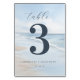 Diese Hochzeitstischkarte zeigt eine ruhige Strandszene mit sanften Wellen und einem weichen blauen Himmel, die eine friedliche und einladende Atmosphäre schafft. Das Design zeigt eine große Zahl "3" in fettem Navy-Blau, ergänzt durch elegante Kursivschrift für das Wort "Tisch", während anpassbare Platzhalter eine Personalisierung mit Namen und Daten ermöglichen. Der minimalistische Stil betont klare Linien und offenen Raum, verstärkt durch einen Wasserfarbeneffekt, der der Meereskulisse eine träumerische Qualität verleiht. Perfekt, um Ihrem besonderen Anlass einen Hauch von Raffinesse zu verleihen, fängt diese Karte die Essenz von Entspannung und Feier ein.